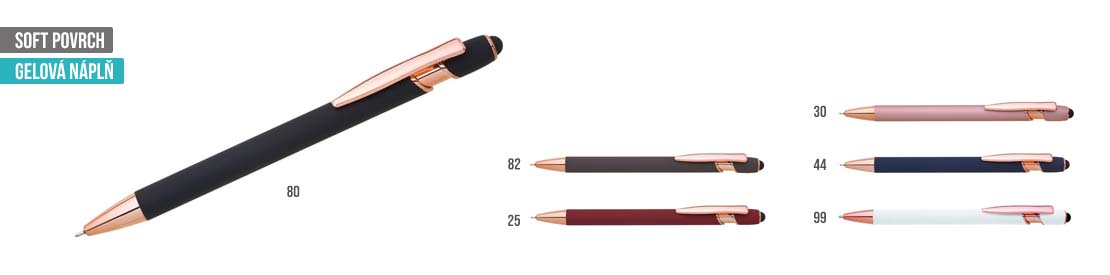 ELLA SOFT je hliníková reklamní propiska. Pogumované tělo propisky v různých barvách se růžovo-zlatými doplňky. Laserový popis po vylaserování ve růžovo-zlaté barvě. Náplň semigel, modře píšící. Maximální velikost potisku: 7×80mm.